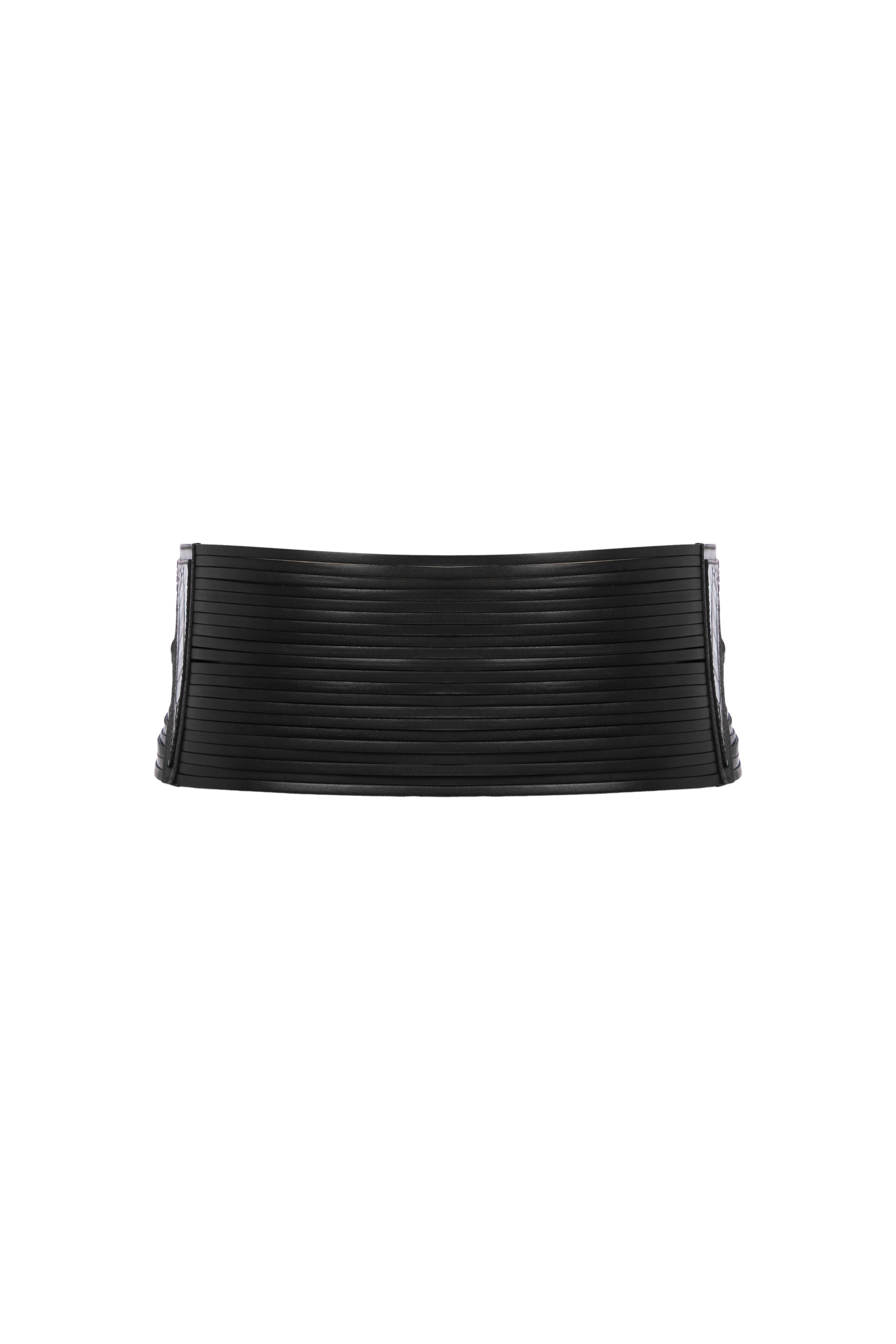 Siyah deri dokusuyla güçlü bir karakter sunan bu geniş kemer, mimari formu ve çift tokalı yapısıyla bele heykelsi bir silüet kazandırır. Katmanlı örgü detayları ve dokulu deri yüzeyi, tasarıma derinlik ve zamansız bir şıklık katarken metal tokalar fonksiyonel olduğu kadar güçlü bir stil vurgusu yaratır. El işçiliğiyle şekillenen bu parça, elbiselerden ceketlere kadar farklı kombinlerde görünümü tamamlayan iddialı bir aksesuardır.