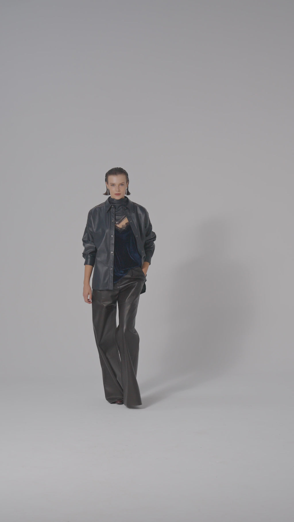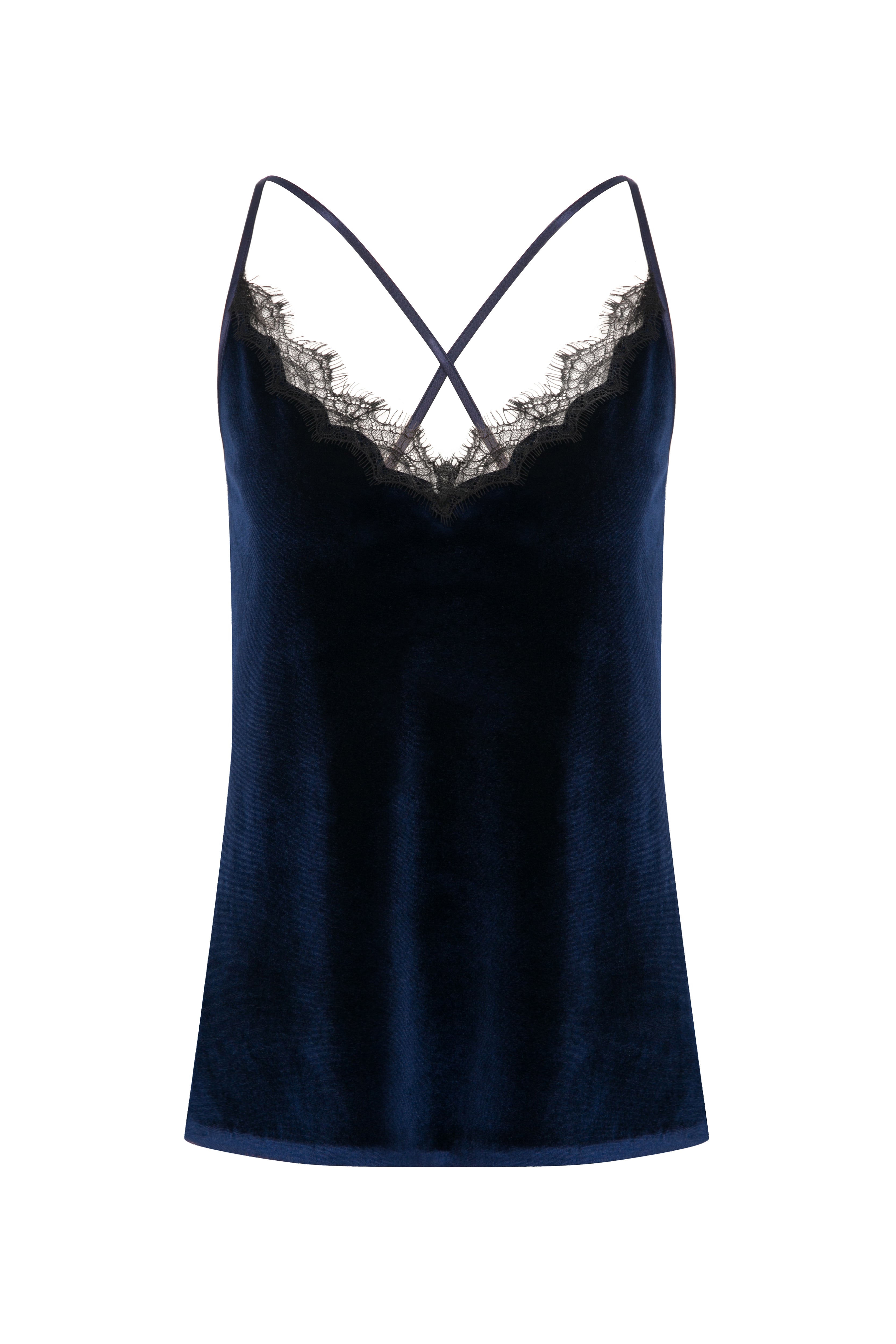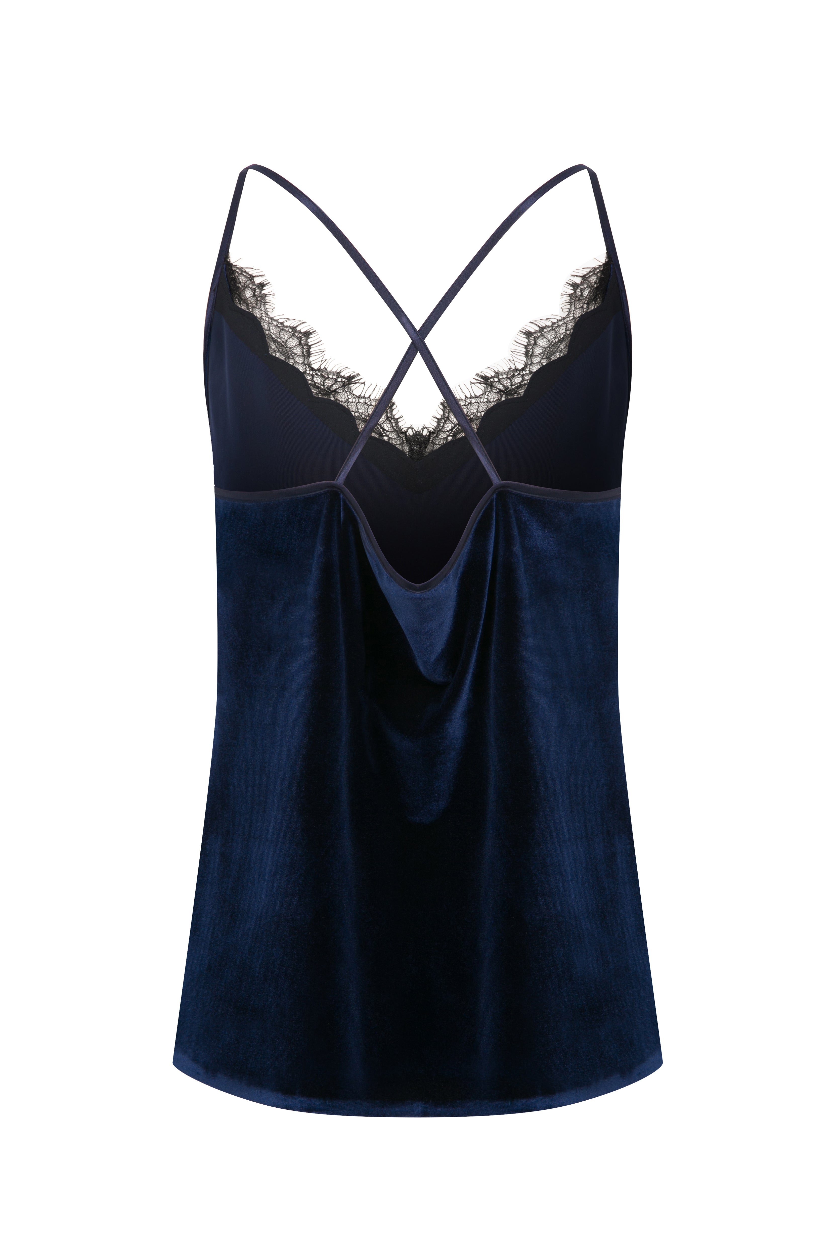 Zamansız feminenliği modern bir dokunuşla buluşturan bu kadife atlet, yumuşak dokusu ve zarif parlaklığıyla dikkat çekiyor. Koyu lacivert tonundaki lüks kadife kumaş, V yaka kısmındaki ince dantel detaylarıyla sofistike bir şıklık sunuyor. İnce askı tasarımı ve sırt kısmındaki çapraz form, sade bir zarafeti vurgularken siluetine zarif bir denge katıyor.Tek başına veya ceket altında kullanılarak hem gece hem gündüz görünümlerine lüks bir dokunuş kazandırır.