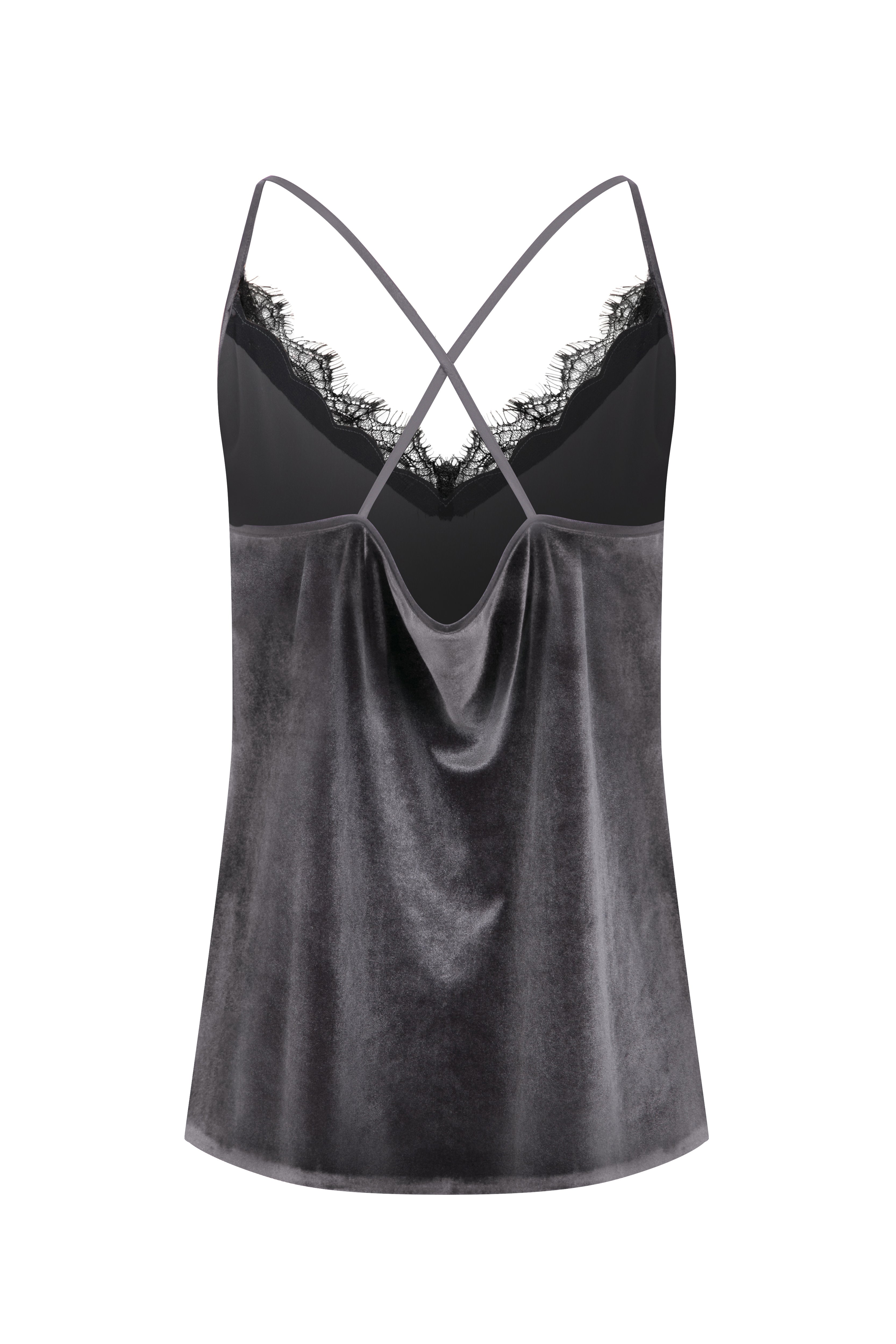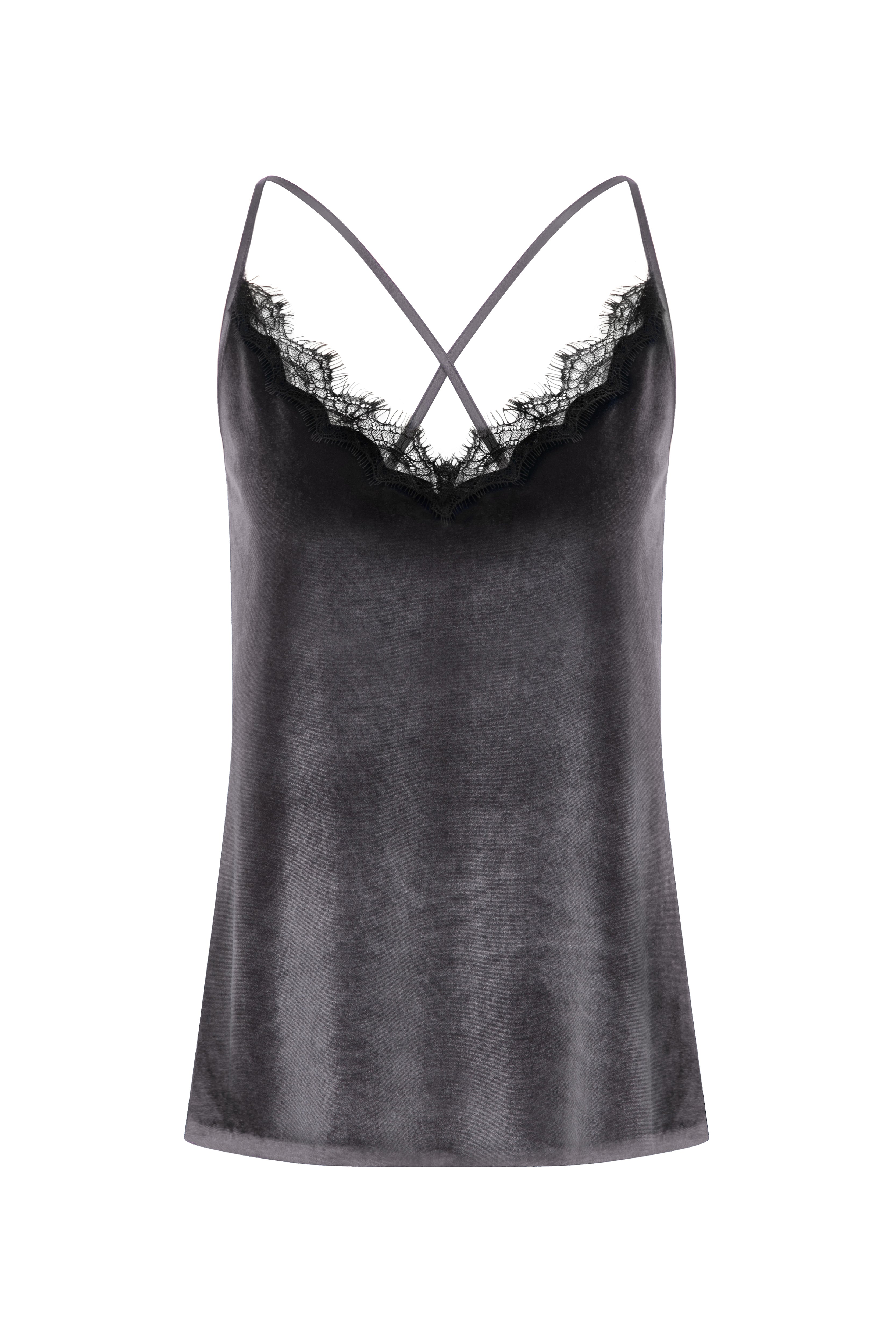 Zamansız feminenliği modern bir dokunuşla buluşturan bu kadife atlet, yumuşak dokusu ve zarif parlaklığıyla dikkat çekiyor. Koyu gri tonundaki lüks kadife kumaş, V yaka kısmındaki ince dantel detaylarıyla sofistike bir şıklık sunuyor. İnce askı tasarımı ve sırt kısmındaki çapraz form, sade bir zarafeti vurgularken siluetine zarif bir denge katıyor.Tek başına veya ceket altında kullanılarak hem gece hem gündüz görünümlerine lüks bir dokunuş kazandırır.