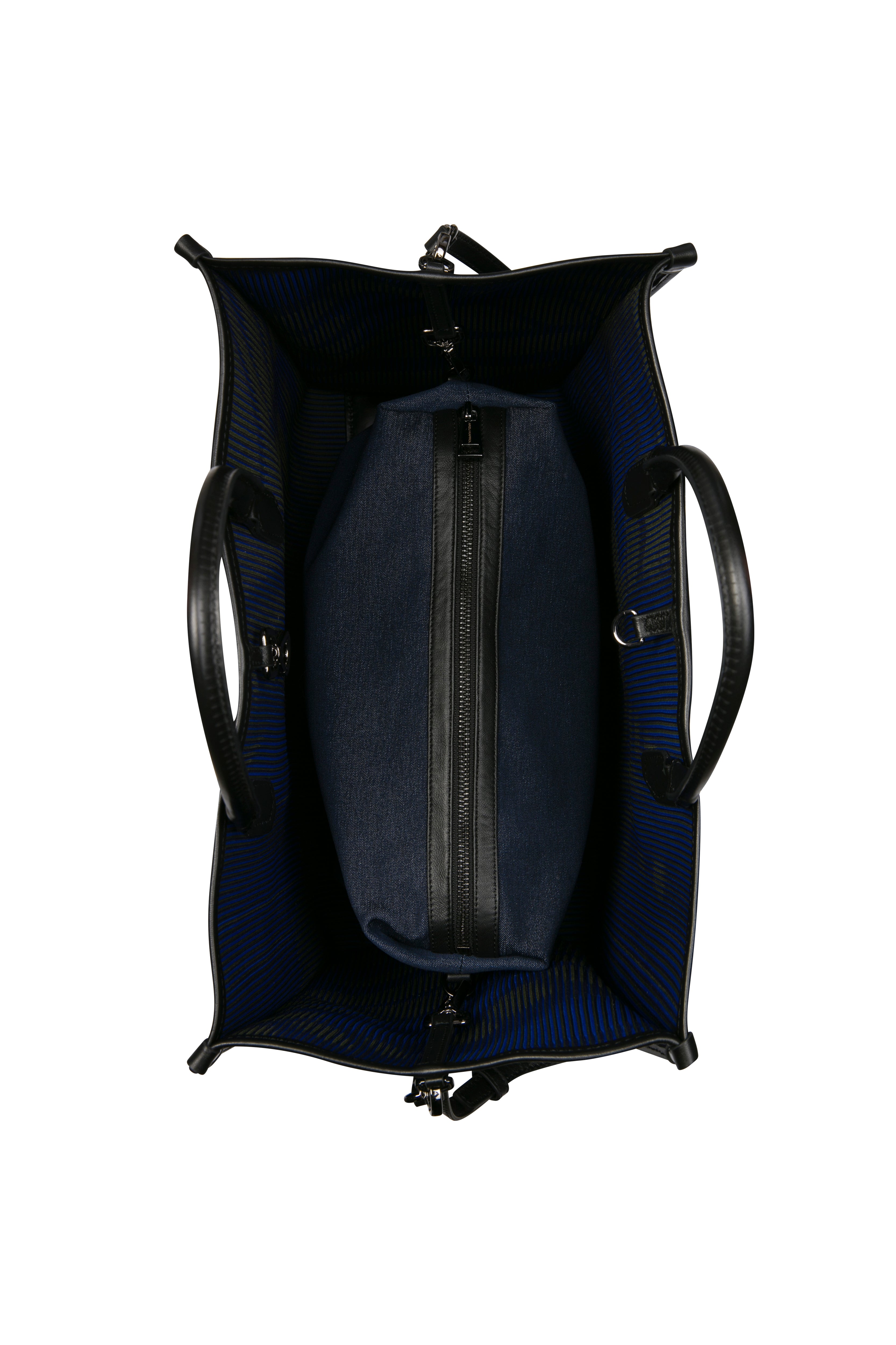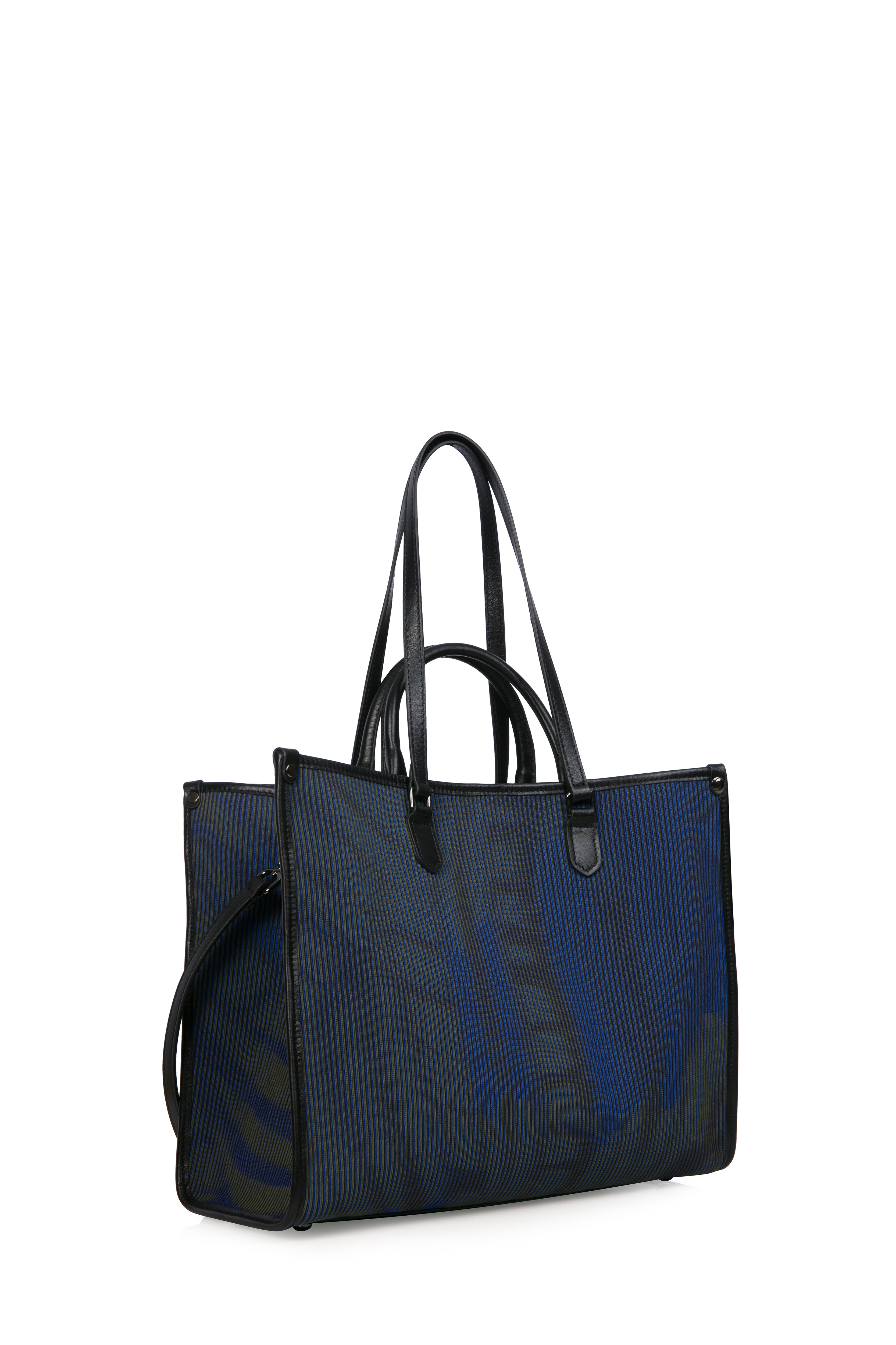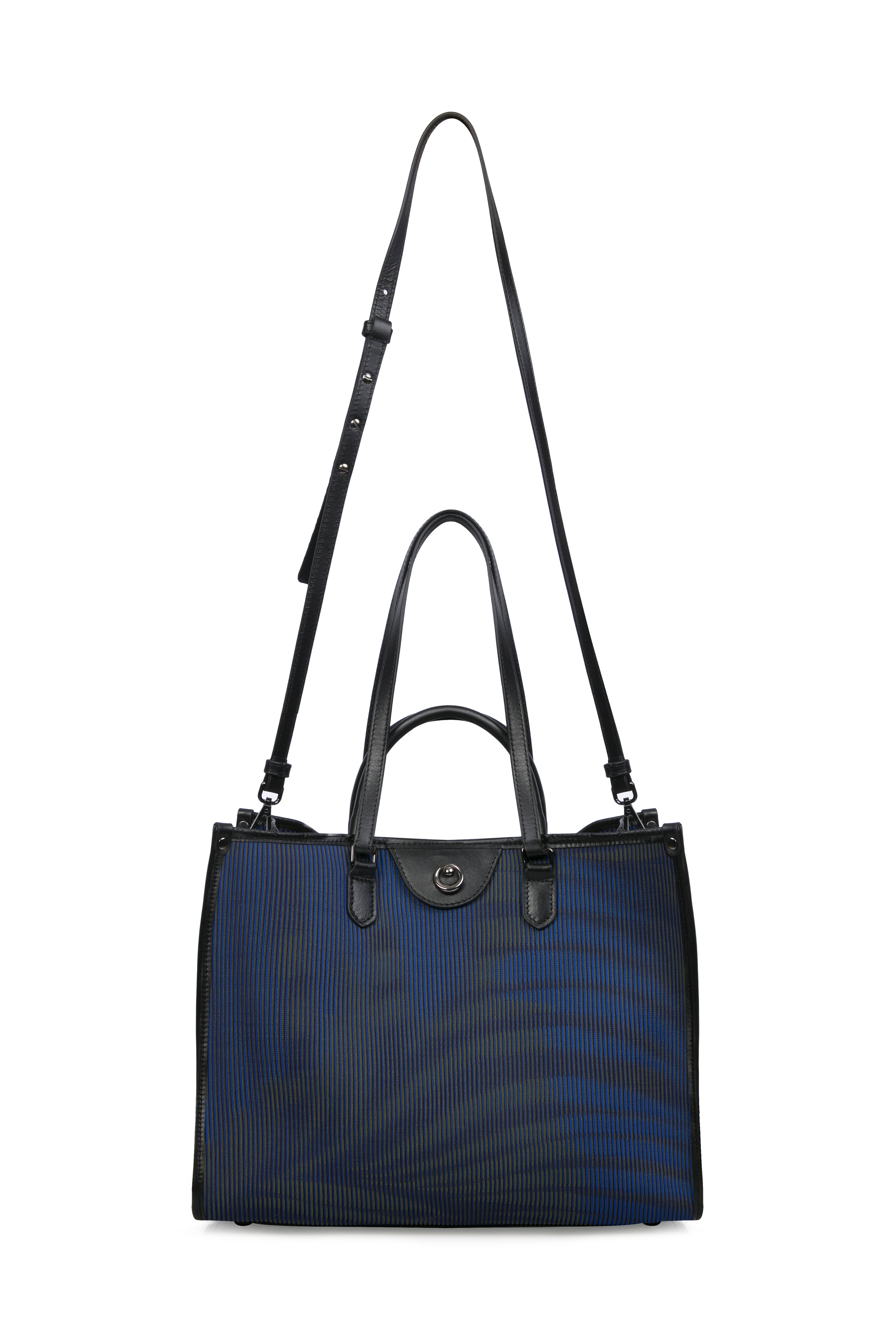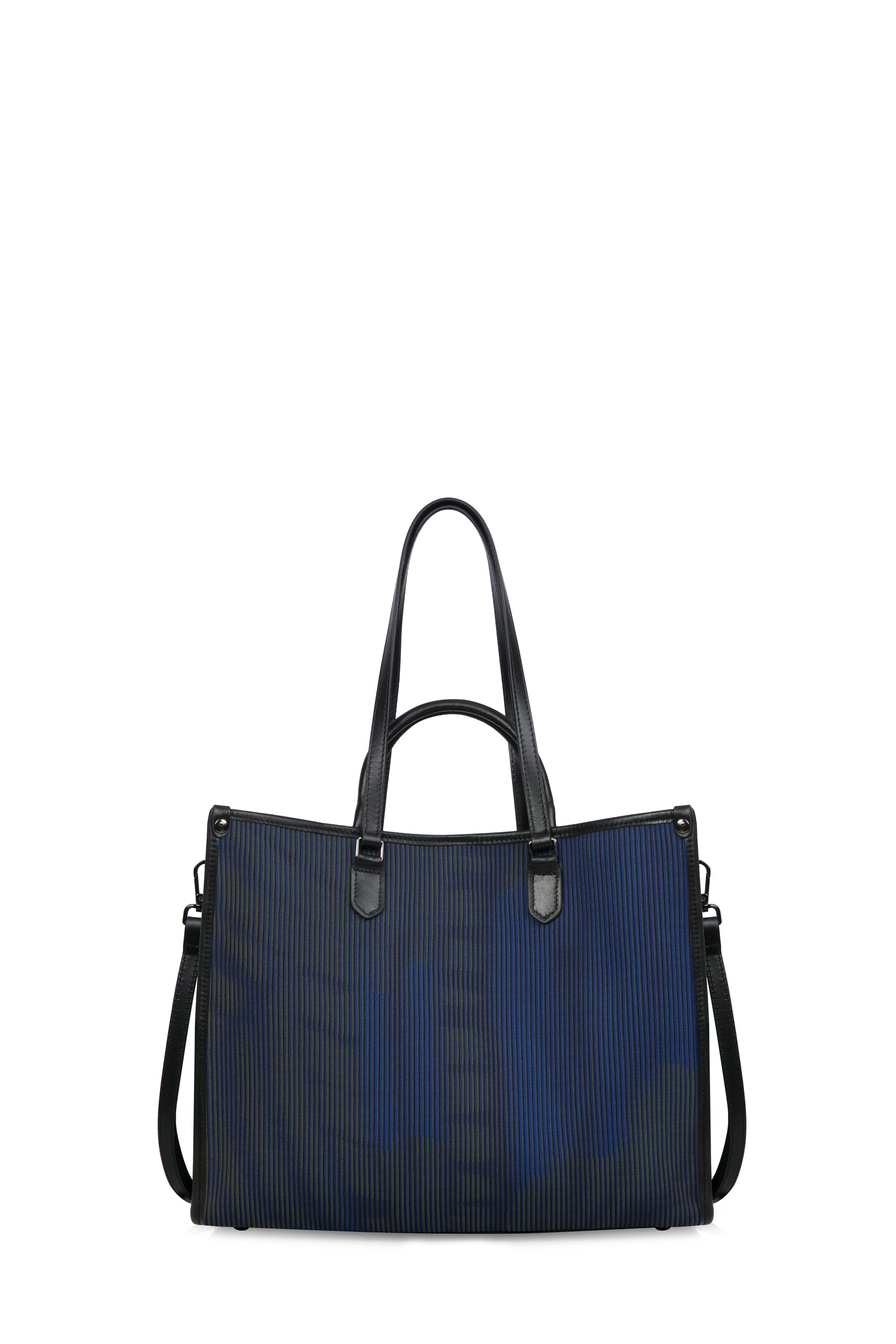 Kelebek kanatlarını andıran çizgisel yüzeyiyle hareket hissi yaratan bu tote çanta, üç boyutlu teknolojisi sayesinde ışık ve hareketle birlikte desenin farklı katmanlarını ortaya çıkarır. Lcivert tonlarındaki renk geçişlerinin yarattığı derinlik, tasarıma modern ve dinamik bir ifade kazandırır.