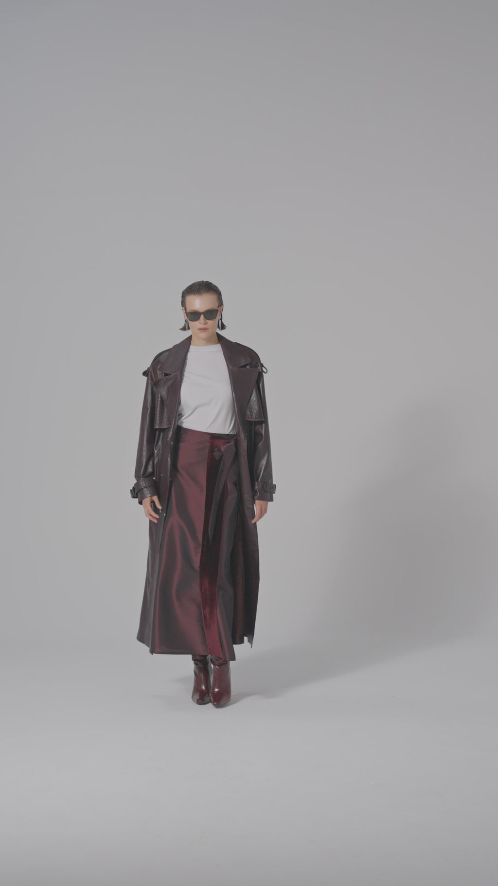 Yumuşak dokulu bordo deri, bedenin çizgilerini zarifçe izlerken modern şehir kadınının duruşunu yeniden tanımlar.Klasik trençkot formu, çağdaş detaylarla yeniden yorumlanıyor; parlak yüzeyi ve güçlü kesimiyle sezona iddialı bir dokunuş getiriyor.