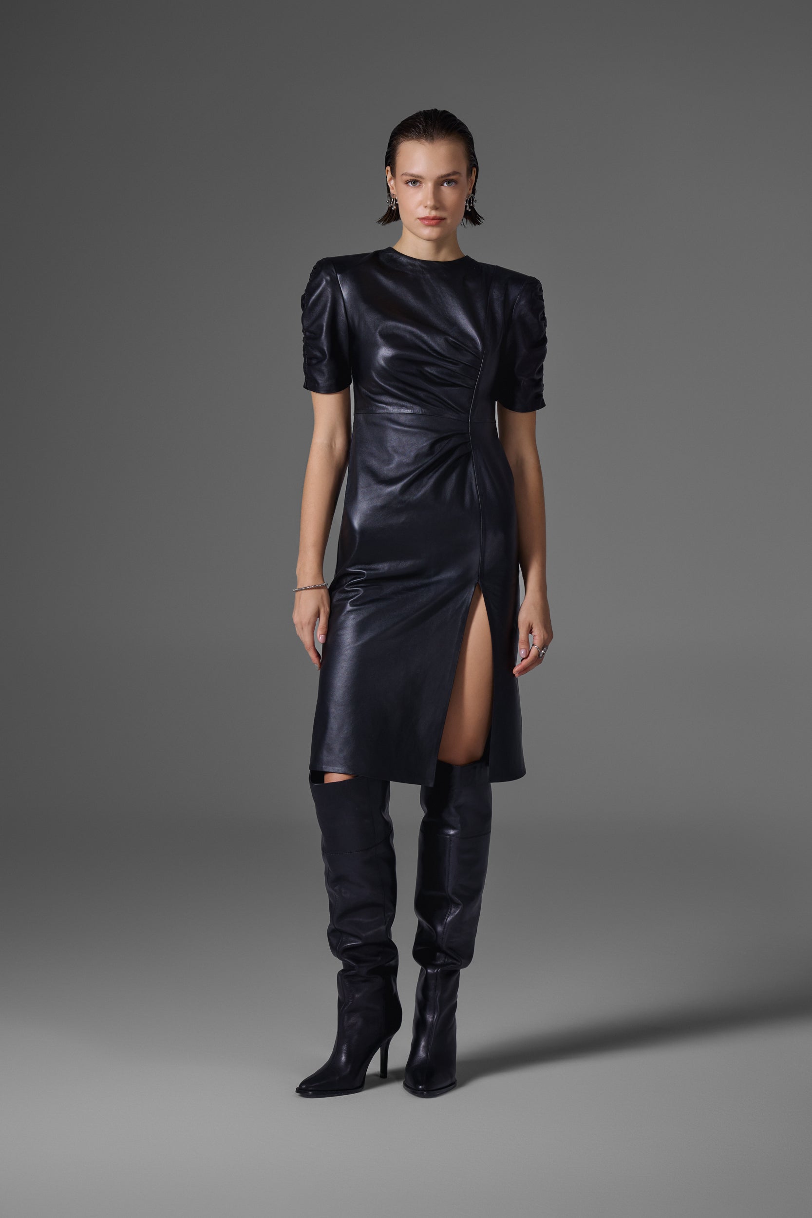 Drapeli detaylarıyla formu vurgulayan, cesur yırtmacıyla öne çıkan ikonik bir siluet.Yırtmaç detayında bulunan gizli fermuar ile ayarlanabilir bir görünüm sunar.