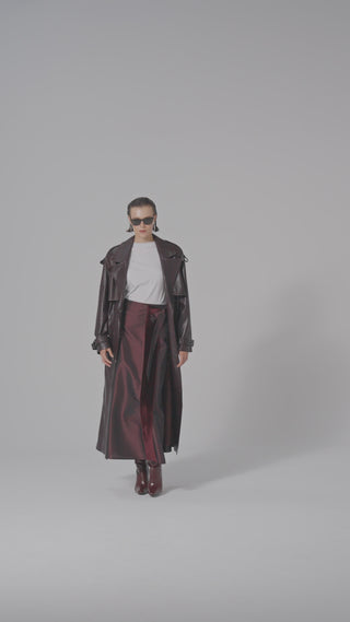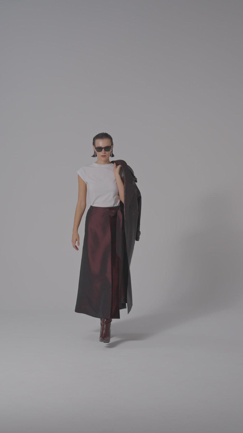 Zarif saten dokusu ve kadife detaylarıyla dikkat çeken bu bordo midi etek, hem günlük hem özel davetlerde şık bir görünüm sunar. Belden bağlamalı tasarımıyla feminen bir siluet oluşturur, akıcı kumaşıyla zarif bir duruş sağlar.