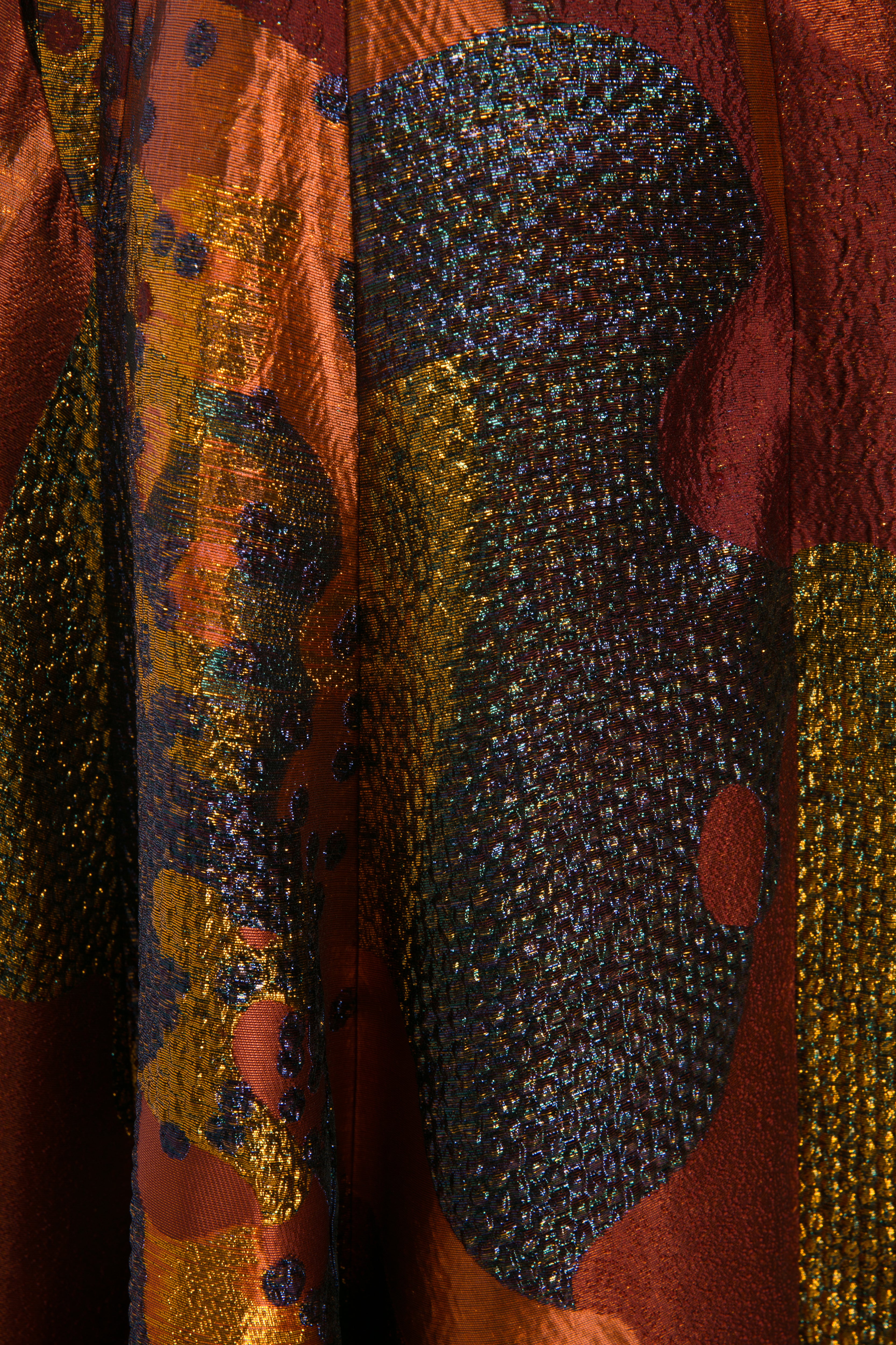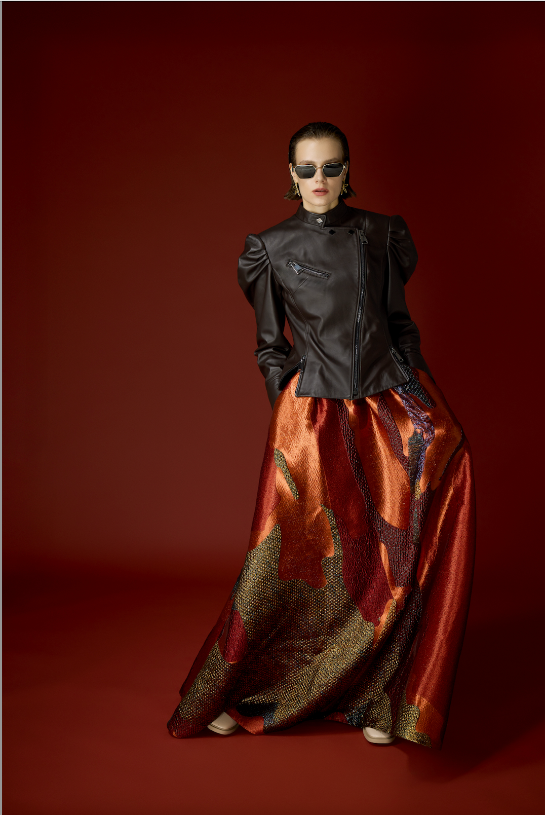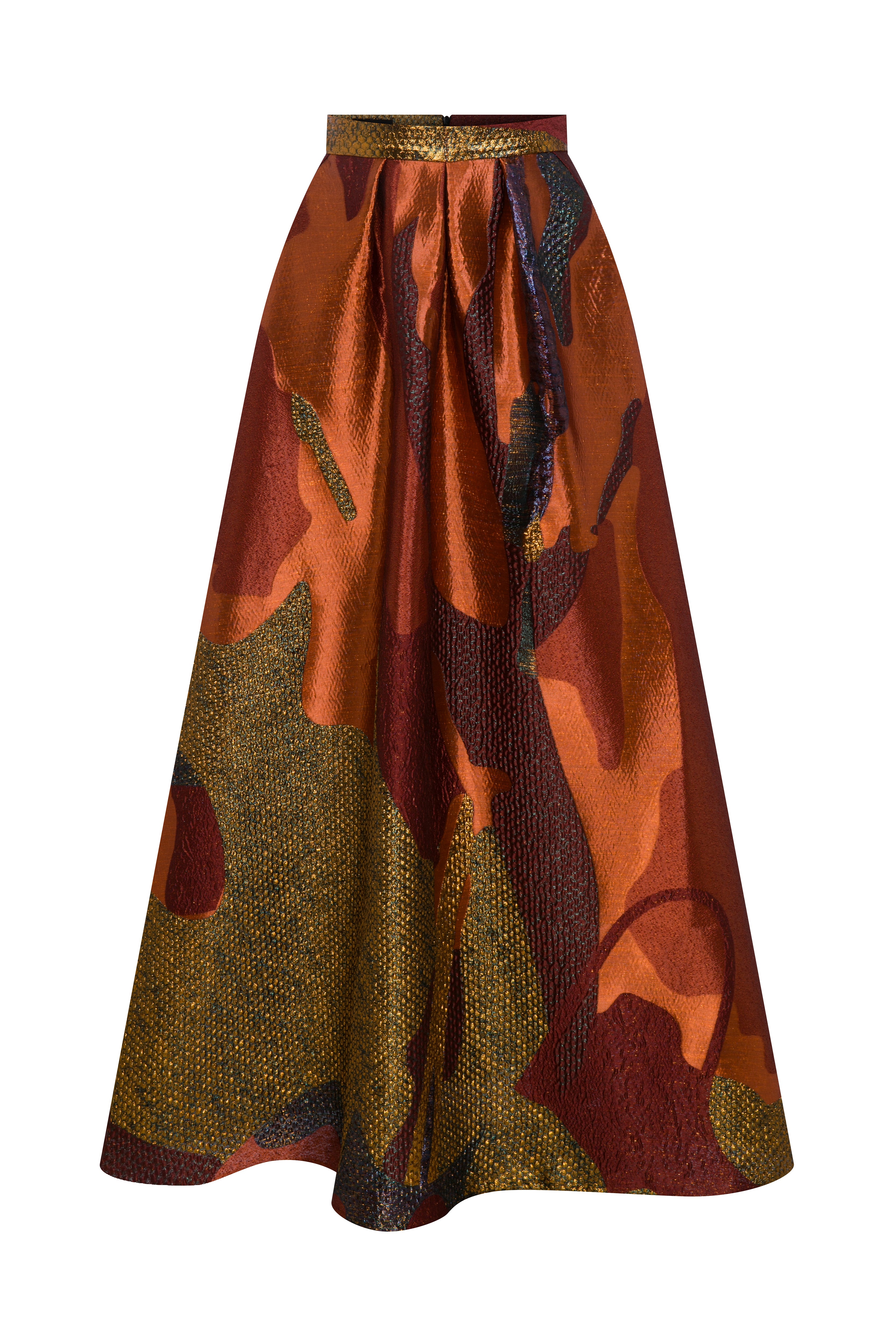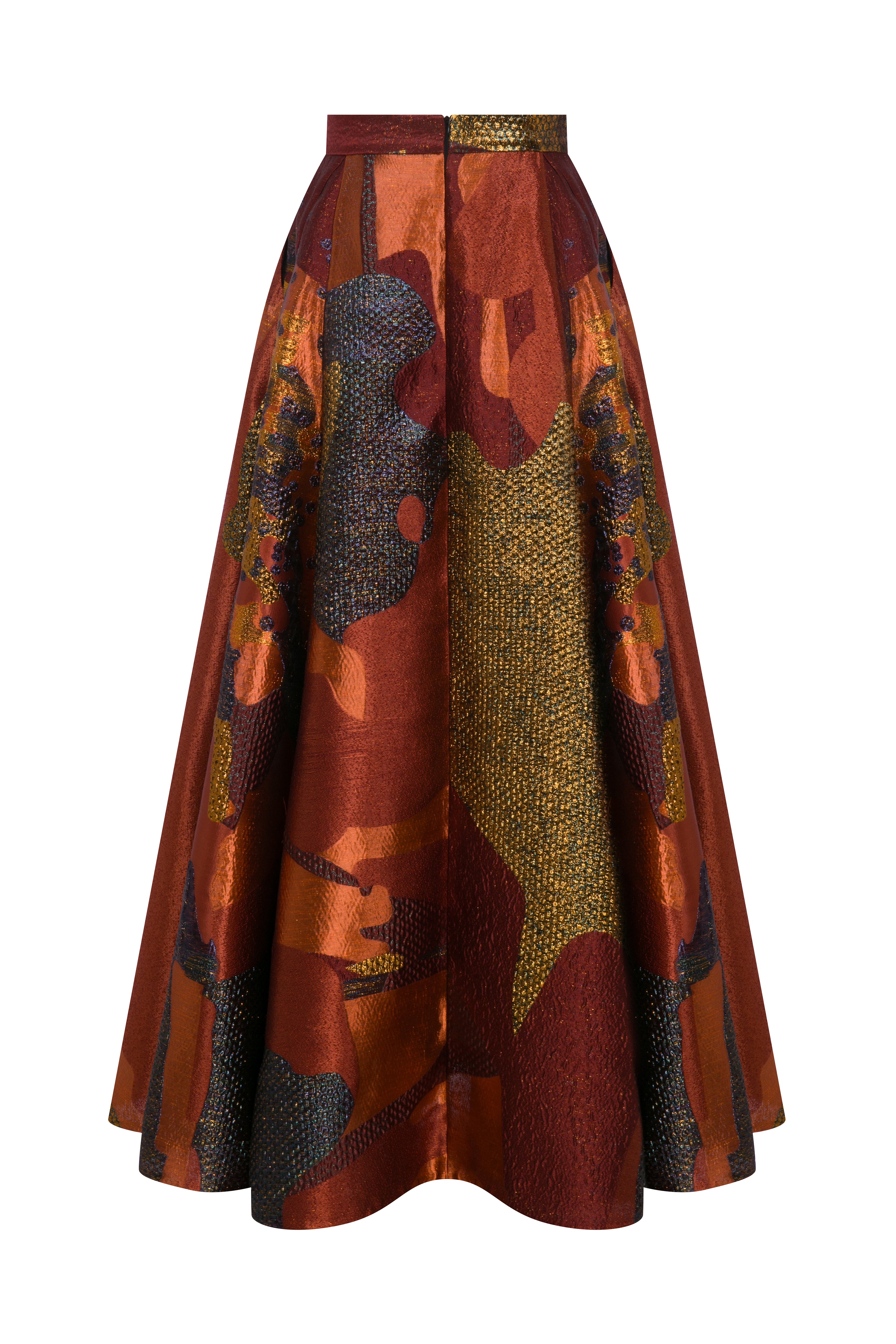 Bu görkemli imza tasarım etek, yoğun tarçın renk tonlarında olup hafif transparan detaylara sahip özel bir kumaştan üretilmiştir. Çok katmanlı ve volümlü bir etki yaratan tasarımı, geometrik desenleri ve renk derinliğiyle dikkat çeker. A kesimi, eteğin zarafetini ve çok yönlülüğünü vurgulayarak hem klasik hem de modern stillerle kombinlenmesini sağlar. Göz alıcı ve şık bir akşam kombini için mükemmel bir Arzu Kaprol tasarımı olacaktır.