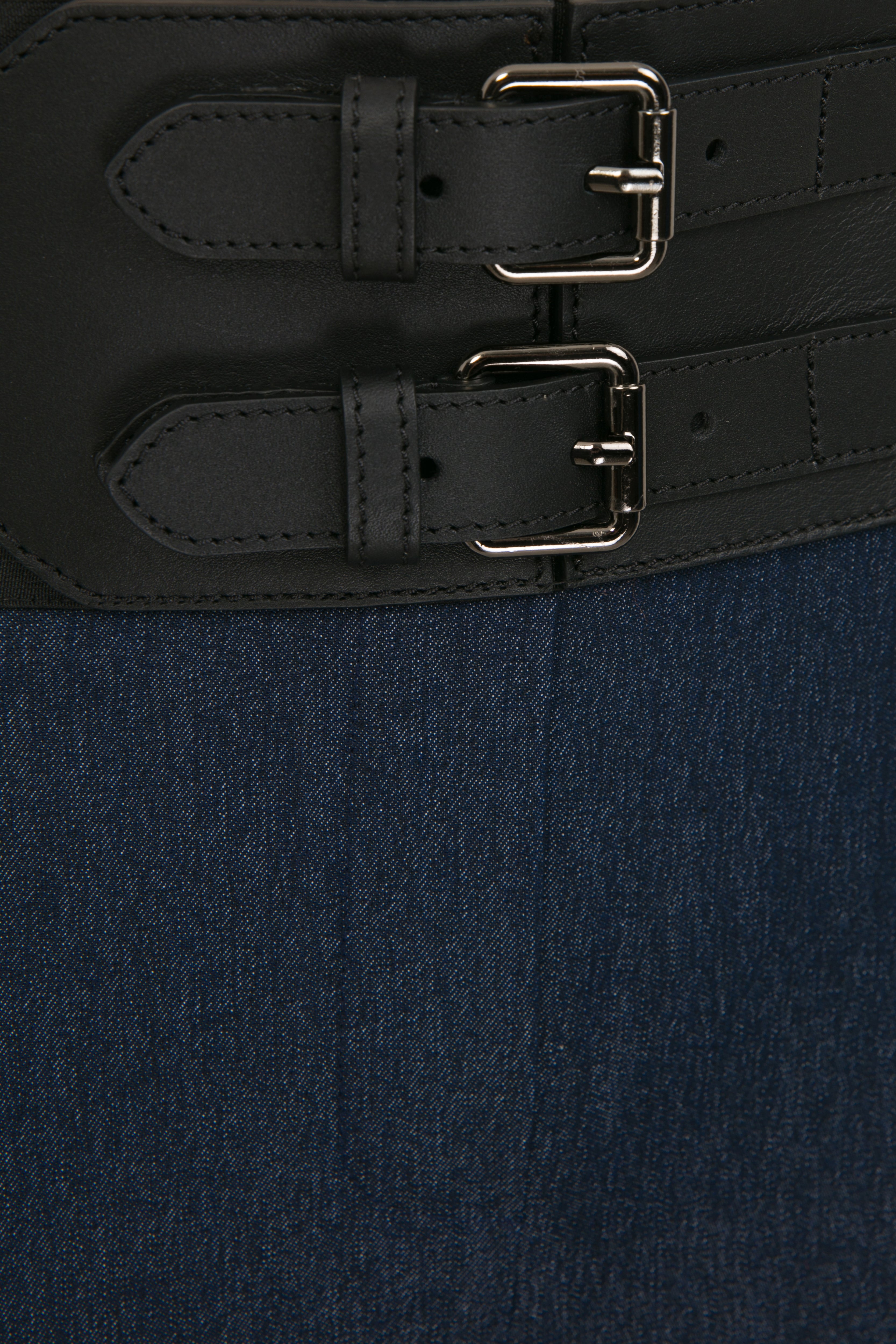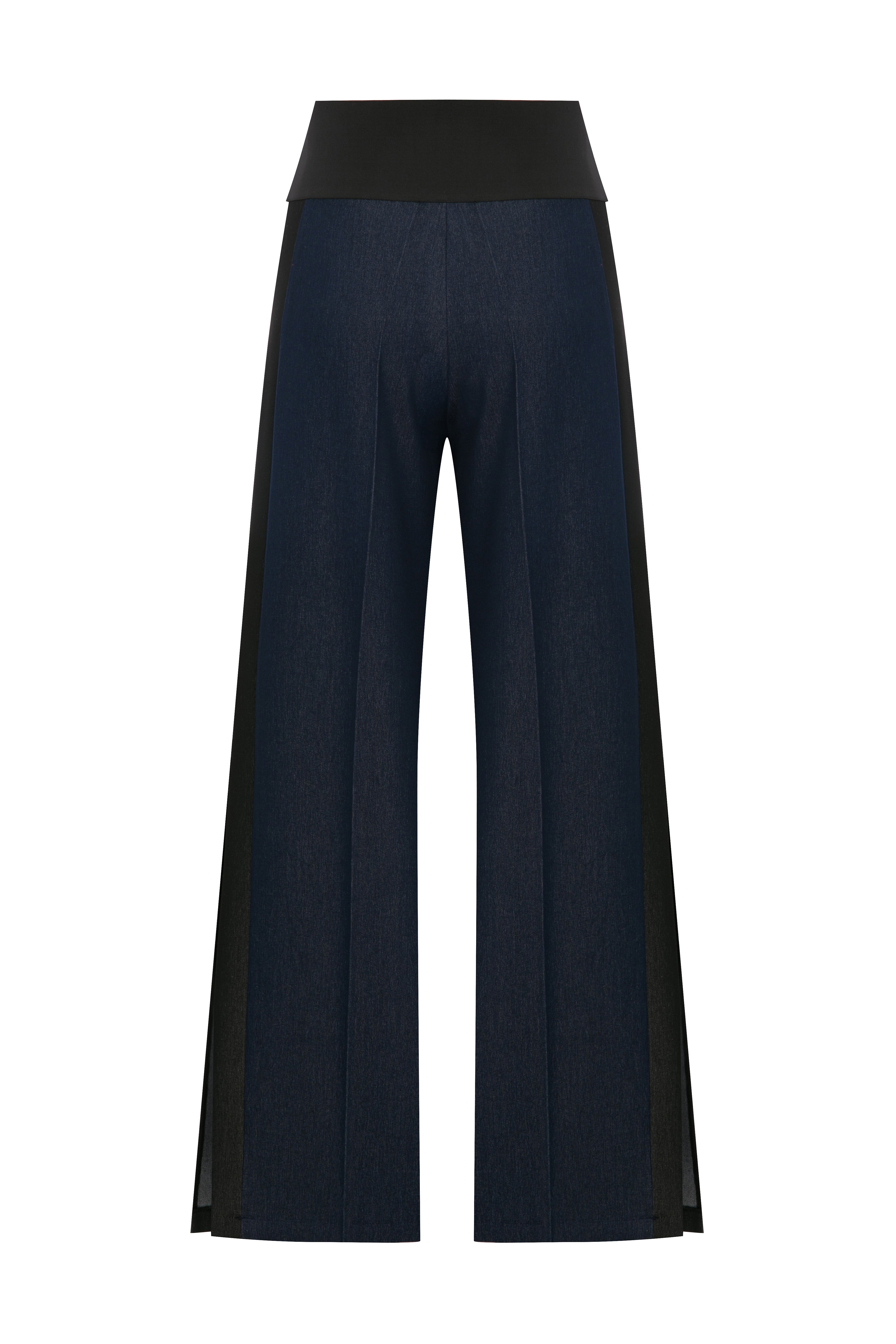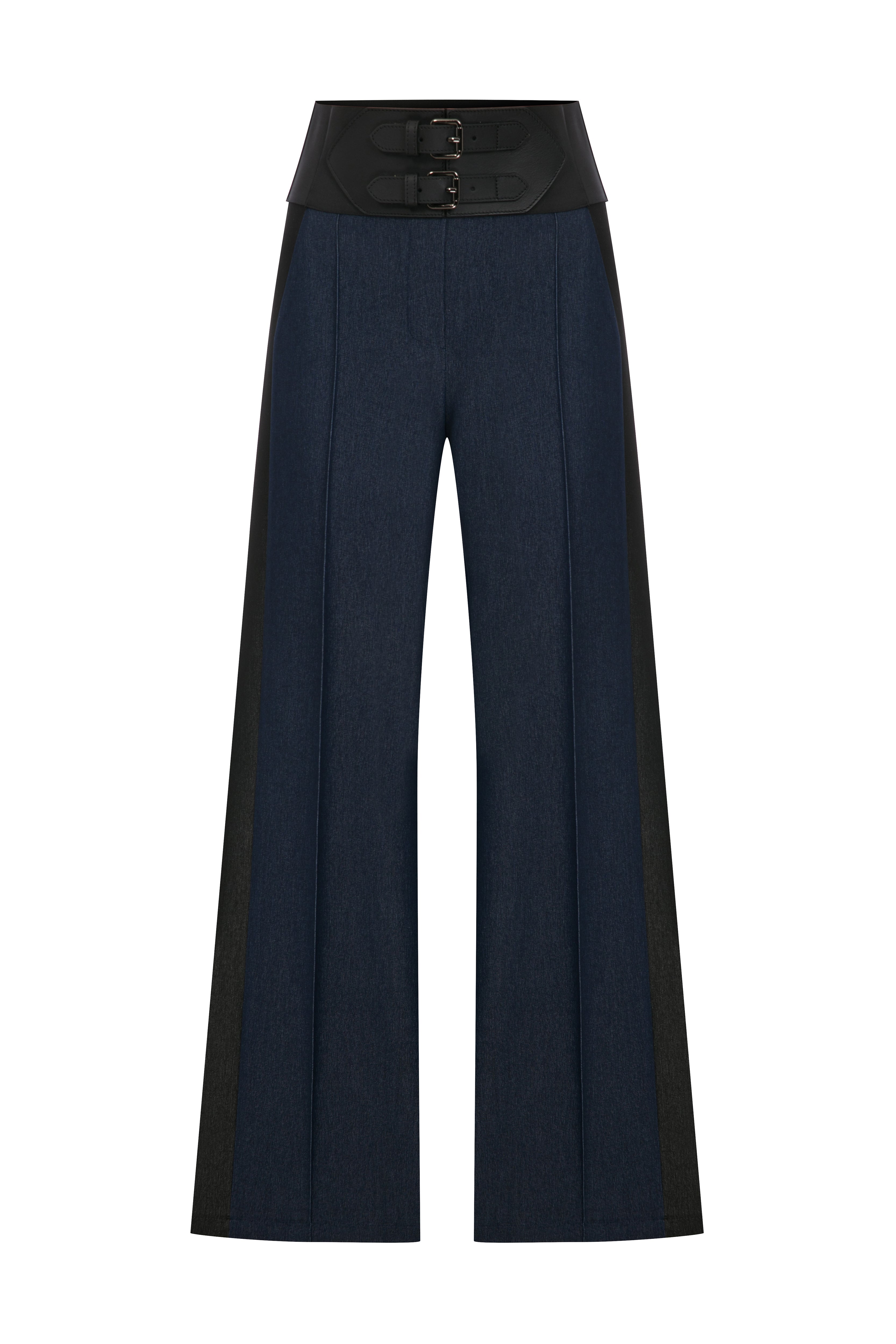 Modern ve güçlü bir siluet sunan bu yüksek bel denim pantolon, bel kısmındaki kemer görünümlü tokalı detayıyla tasarıma karakter kazandırır. Düz ve geniş paça formu bacak boyunu daha uzun gösterirken, ön kısımdaki dikiş detayları pantolona zarif bir yapı kazandırır.