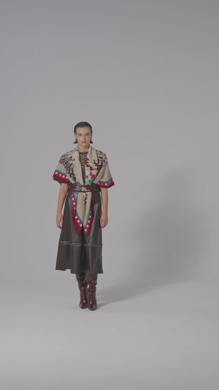 Güçlü siluetiyle dikkat çeken bu elbise, yumuşak dokulu deri kumaşıyla modern bir zarafet sunar. Göğüs kısmındaki bağlama detayı feminen bir vurgu yaratırken, midi boy kesimiyle dengeli bir siluet oluşturur. Bel hattını vurgulayan dikişler ve etek ucundaki örgü detay, tasarıma el işçiliği hissi kazandırır. Gündüzden geceye uzanan zamansız bir stil için ideal.