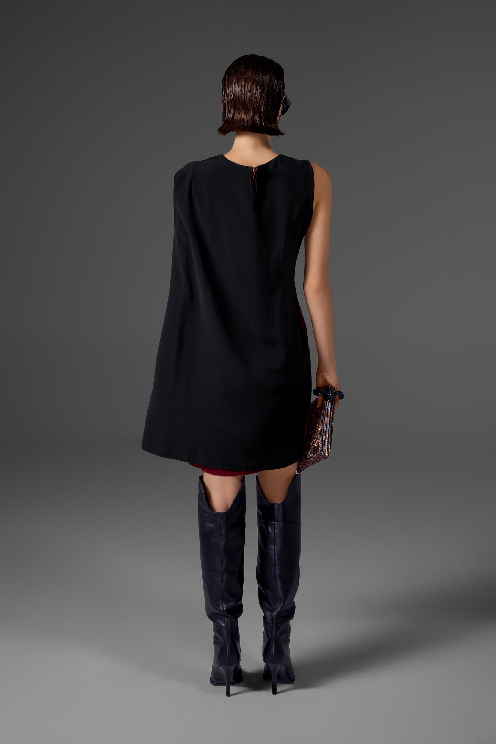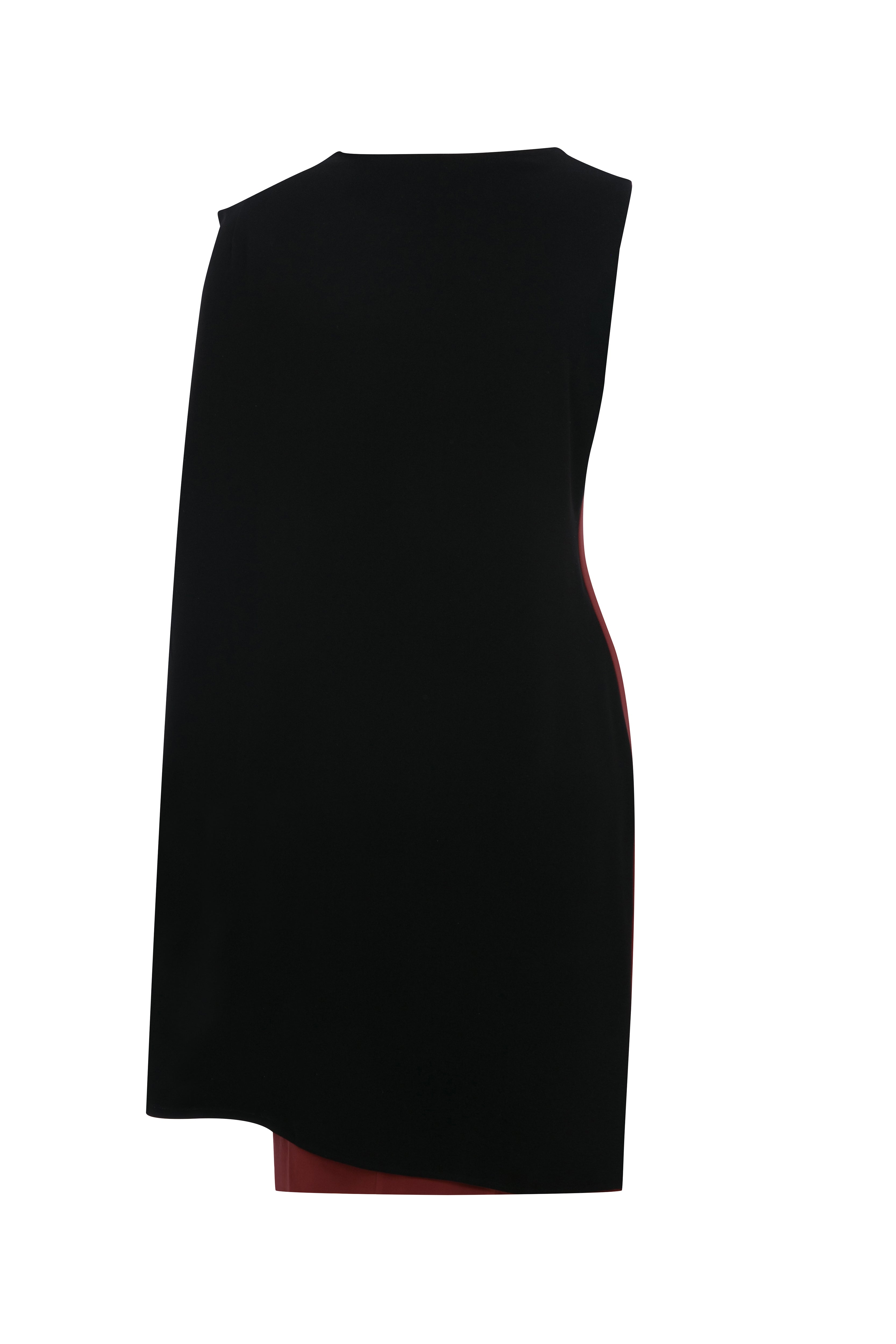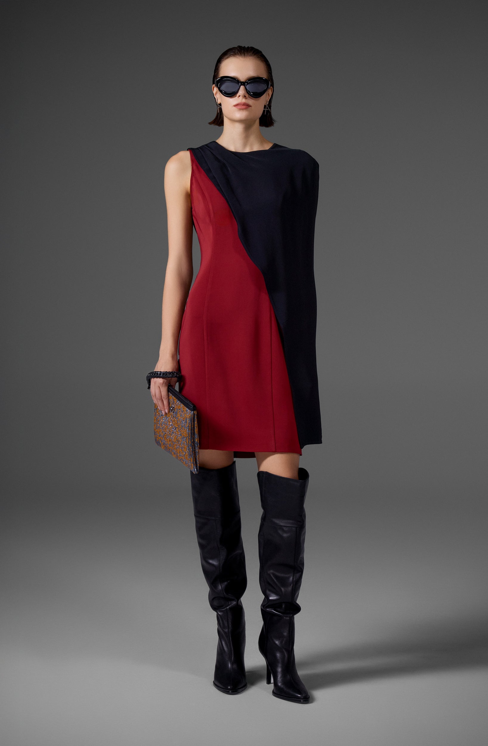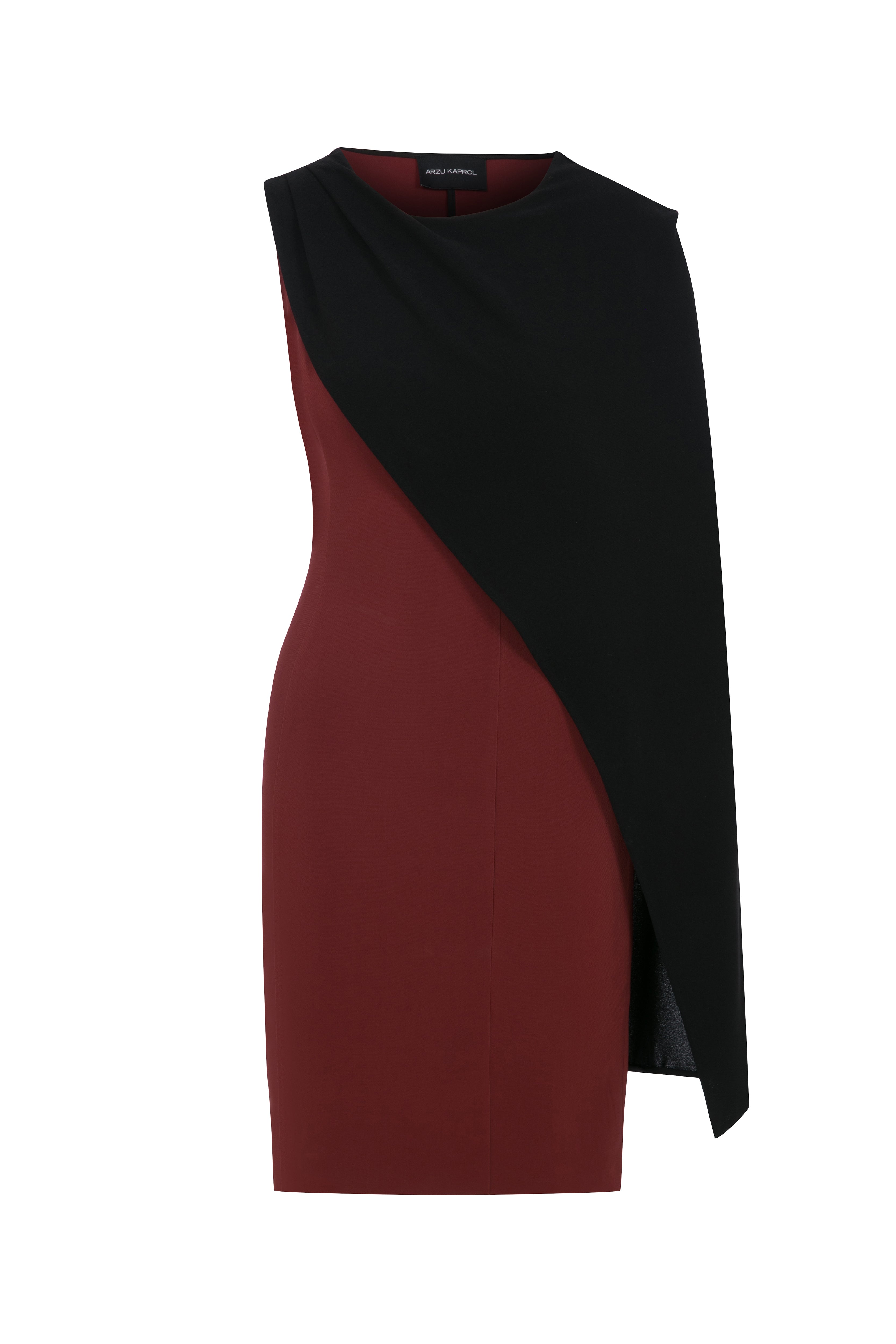 Siyah ve bordo blok renk geçişleriyle modern bir kontrast sunan bu elbise, asimetrik kesimiyle güçlü bir silüet yaratıyor. Drapeli omuz detayı, tasarıma heykelsi bir hareket katarken minimal formu sofistike bir şıklık sağlıyor. Günün her anında stilinizi öne çıkaracak, zamansız ve özgün bir parça.
