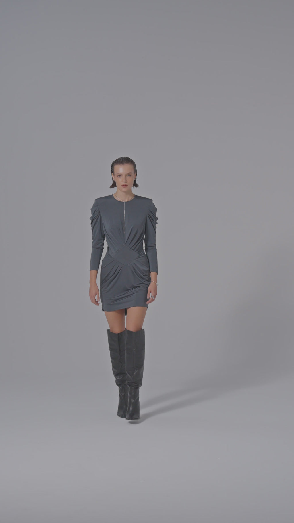 Minimalist tasarım ile heykelsi bir formun birleştiği bu elbise, dramatik drape detaylarıyla modern bir silüet yaratıyor. Omuzlardaki büzgüler ve beldeki geometrik form, güçlü bir duruş sunarken vücut hatlarını zarifçe vurguluyor. Hem şehirli gündüz şıklığı hem de akşam davetleri için sofistike bir seçenek.