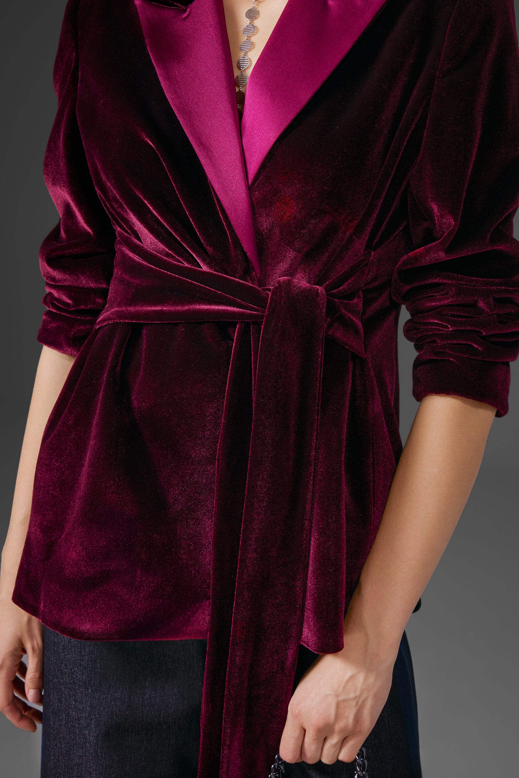 Derin bordo kadifenin dokusu, modern ve cesur bir yorum kazanıyor. Belden bağlamalı kesim, siluete zarif bir feminenlik katarken güçlü bir duruş sergiliyor. Işıltılı aksesuarlar ve ikonik detaylar ile tamamlanan bu görünüm, şehirli kadın için hem gündüz hem de geceye uygun sofistike bir seçenek sunuyor.
