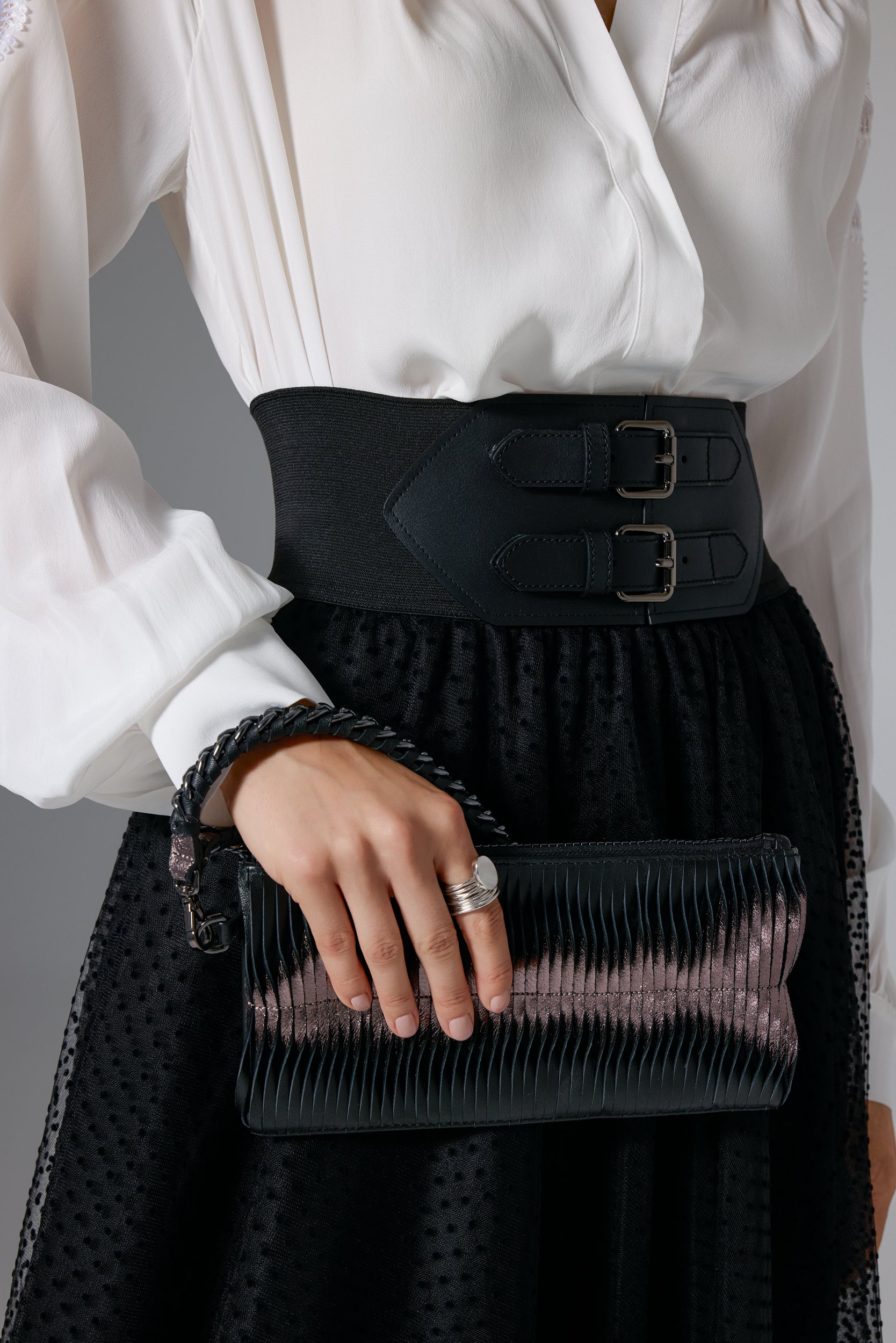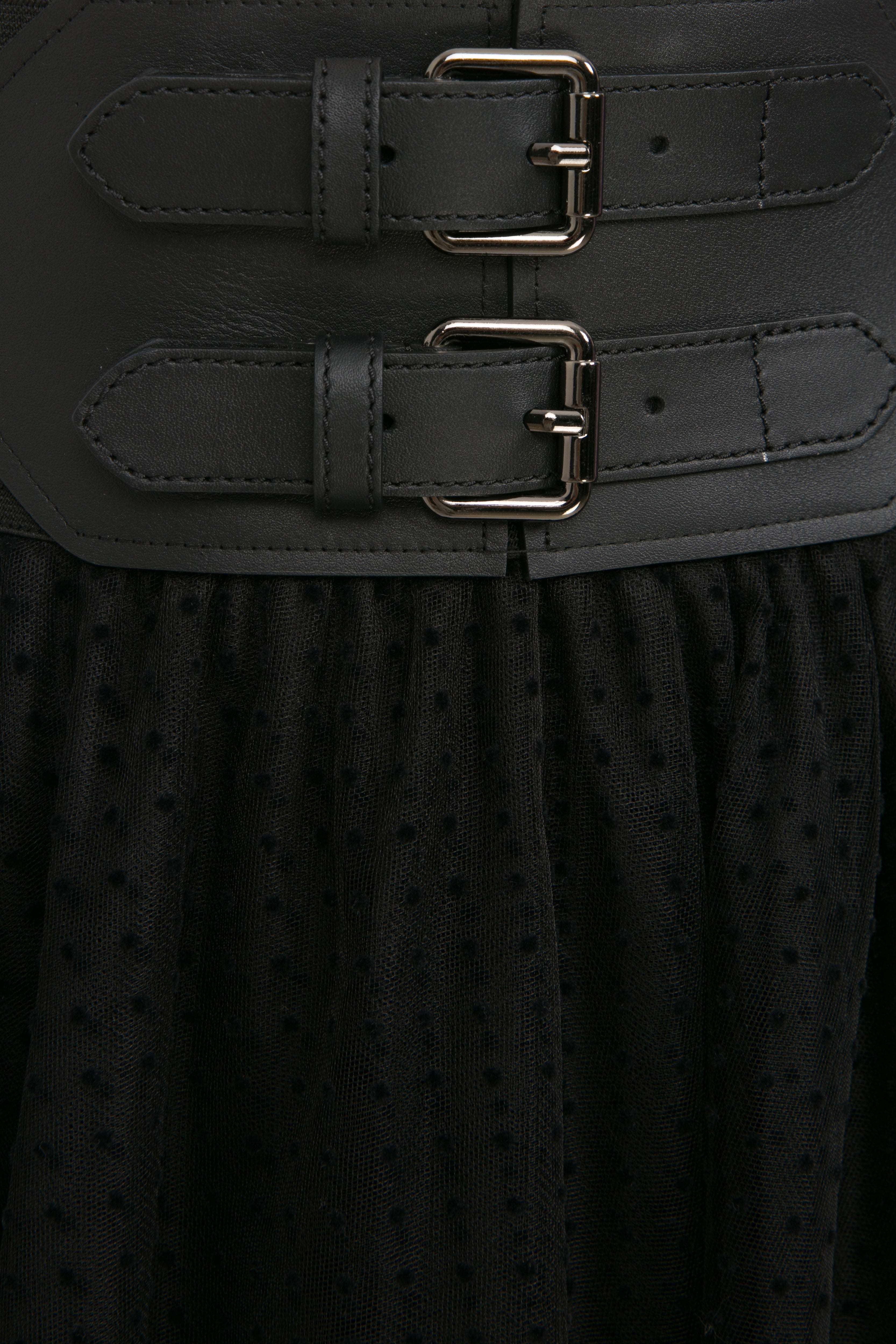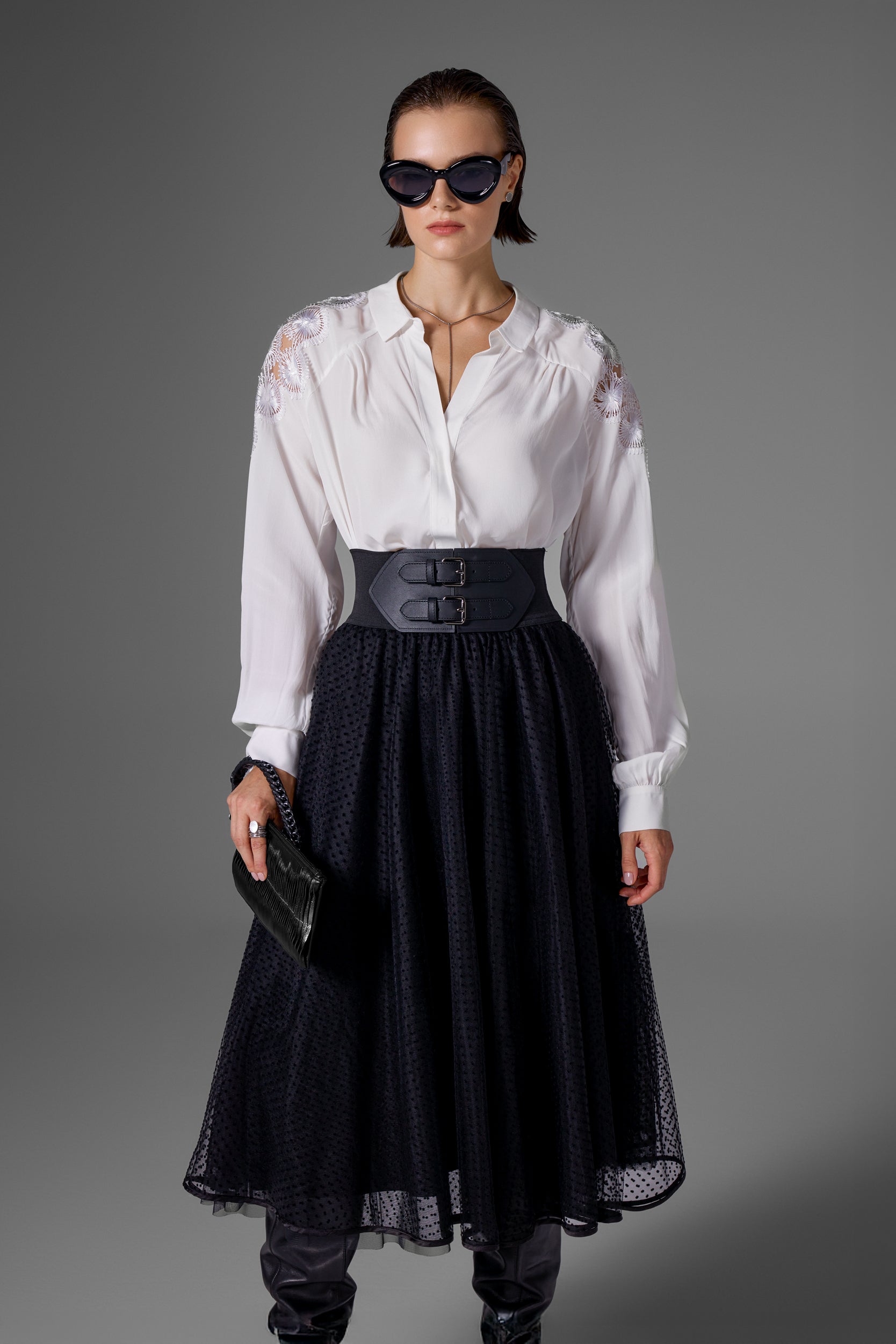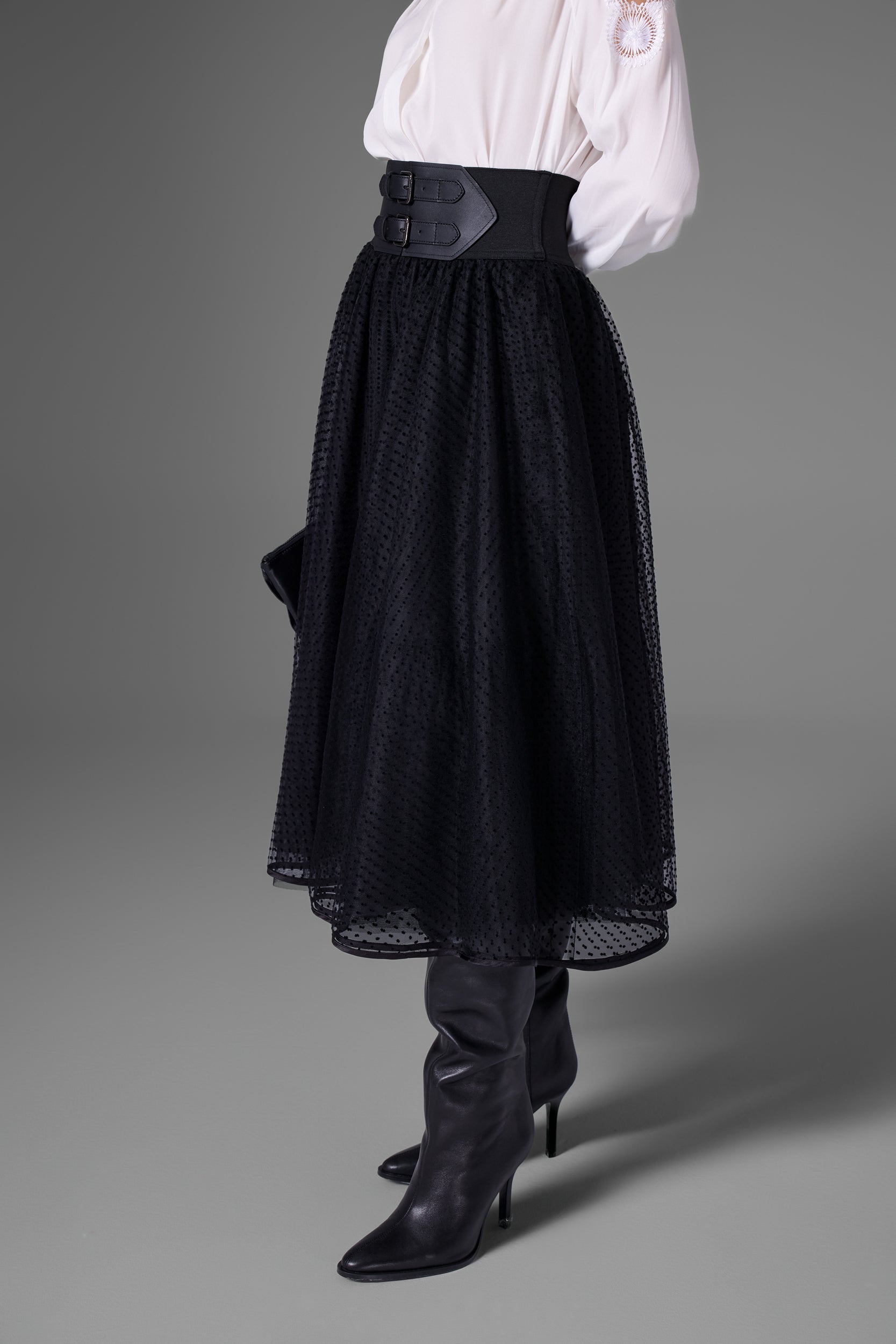 Zarif tül dokusu ve belden dökümlü A formuyla modern bir siluet sunar. Çift tokalı geniş kemeri feminen bir vurgu katarken, midi boyu hem şıklık hem de rahatlık sağlar. Günlük stilinizden davet kombinlerinize uzanan zamansız bir parça.