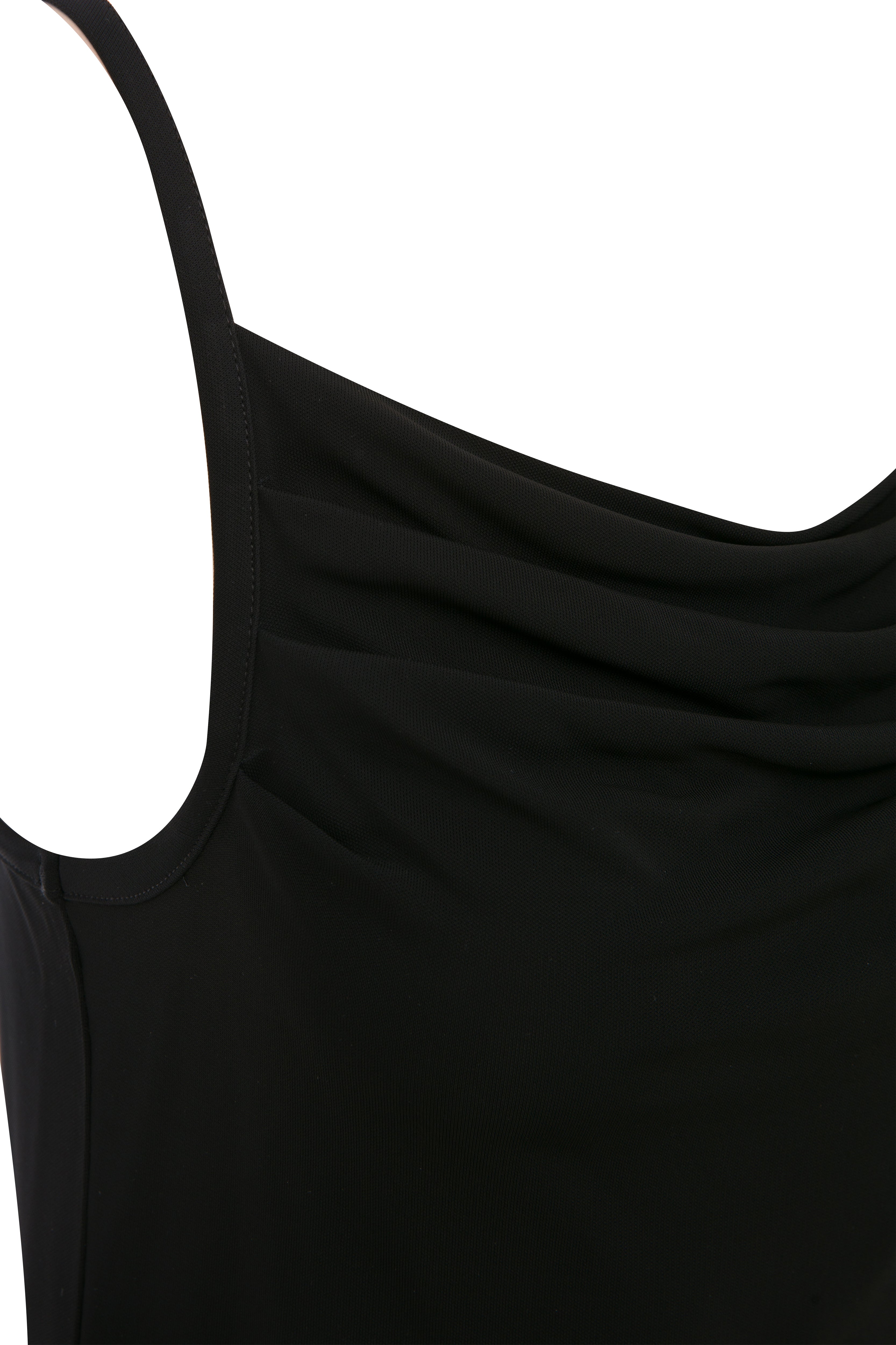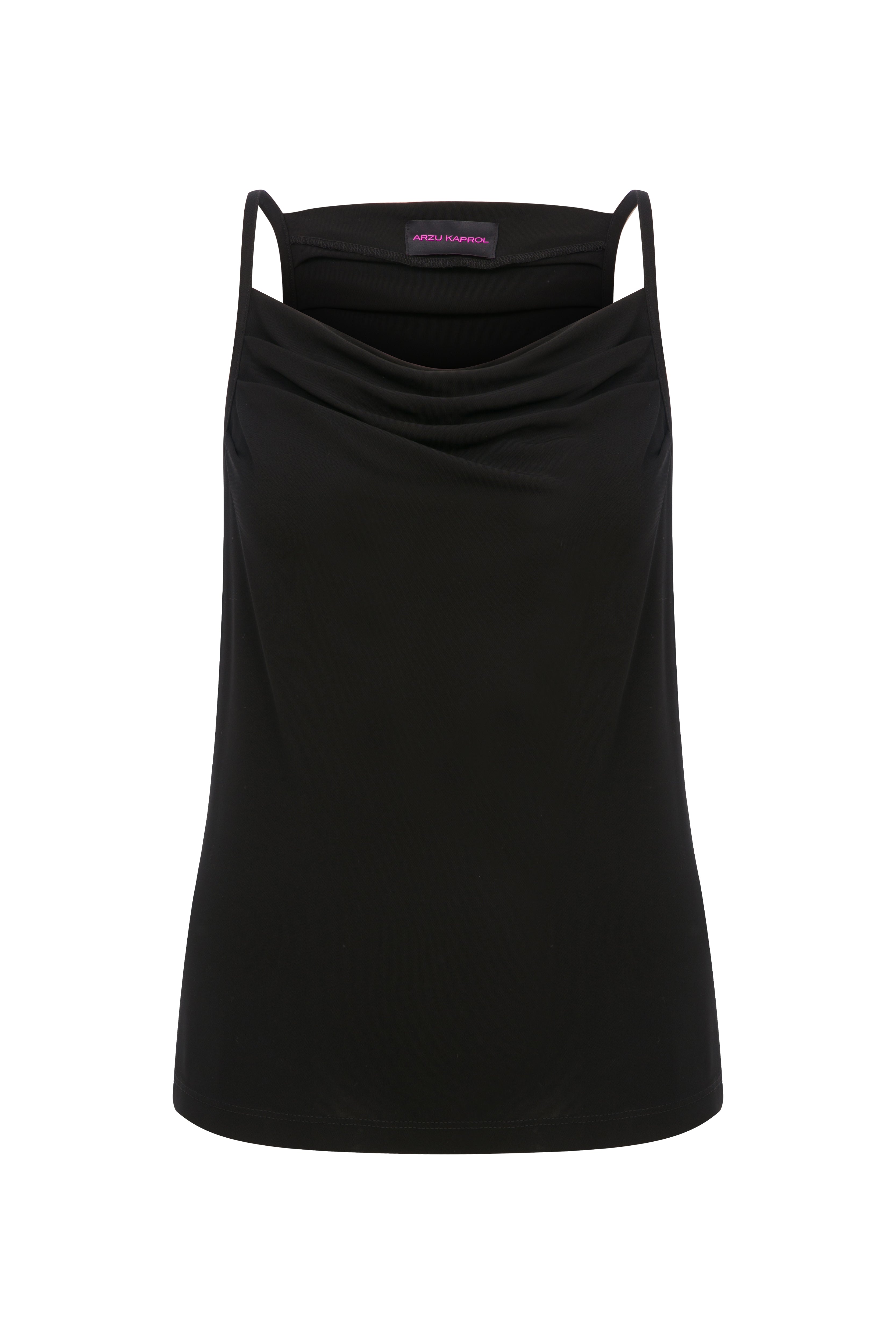 This minimalist blouse, with its sleeveless design, is crafted from a soft, smooth black fabric. The draped detail at the neckline adds volume while offering an elegant and feminine look. The thin straps accentuate the design's sophistication, making it an ideal piece for both daytime and evening outfits. Highlighting modern aesthetics and comfort, this blouse boasts a versatile and timeless style.